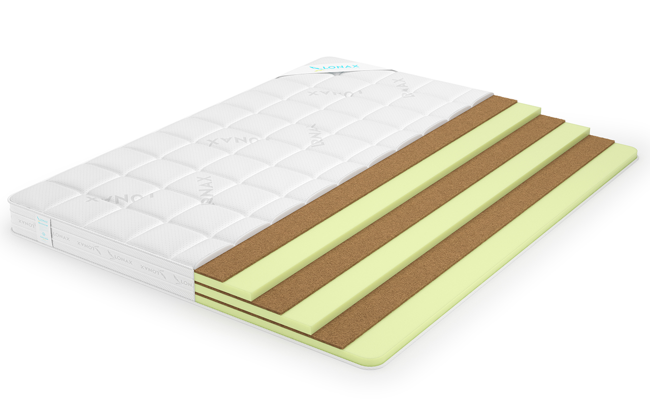 Наличие кокосового волокна толщиной 1 см. в составе придает матрасу жесткость, обеспечивает дополнительную поддержку позвоночника во время сна, формирует ортопедический эффект.